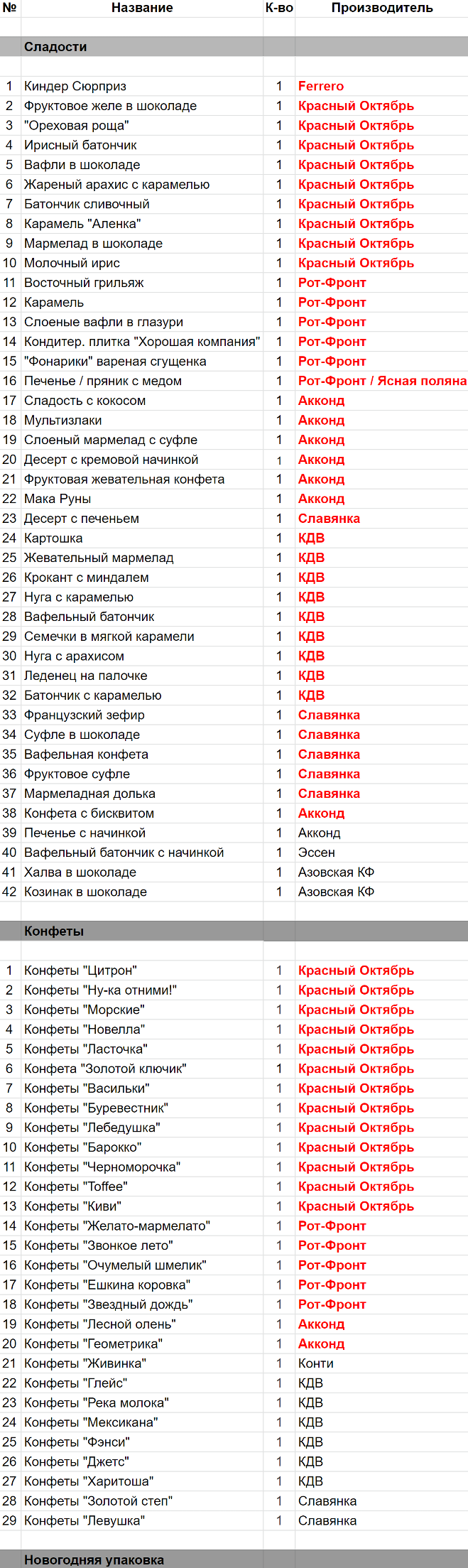 Фруктовое желе в шоколаде (1 шт), "Ореховая роща" (1 шт), Ирисный батончик (1 шт), Вафли в шоколаде (1 шт), Жареный арахис с карамелью (1 шт), Батончик сливочный (1 шт), Карамель "Аленка" (1 шт), Мармелад в шоколаде (1 шт), Молочный ирис (1 шт), Конфеты "Цитрон" (1 шт), Конфеты "Ну-ка отними!" (1 шт), Конфеты "Морские" (1 шт), Конфеты "Маска" (1 шт), Конфеты "Ласточка" (1 шт), Конфета "Золотой ключик" (1 шт), Конфеты "Васильки" (1 шт), Конфеты "Буревестник" (1 шт), Конфеты "Лебедушка" (1 шт), Конфеты "Барокко" (1 шт), Конфеты "Черноморочка" (1 шт), Конфеты "Toffee" (1 шт), Конфеты "Киви" (1 шт)